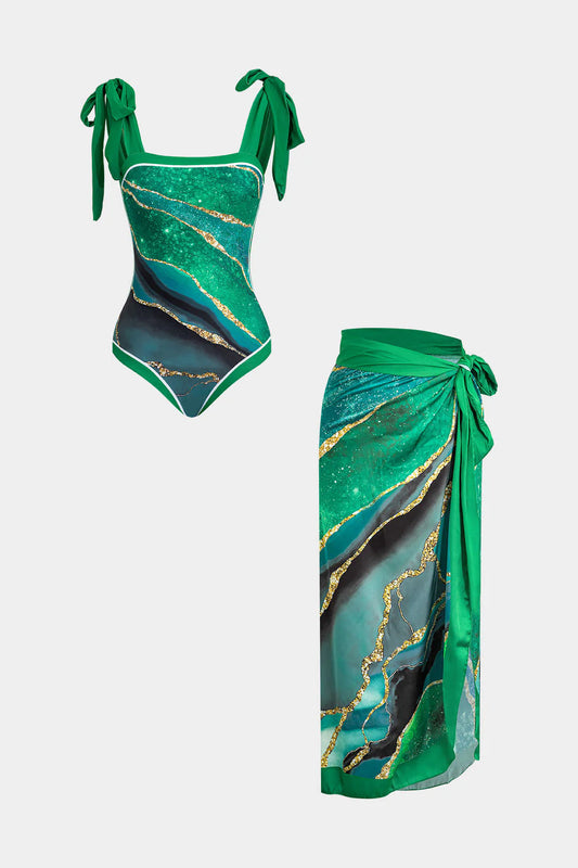 Ürün Türü: Tek parça mayo ve pareo seti Renk & Desen: Canlı zümrüt yeşili, mermer...