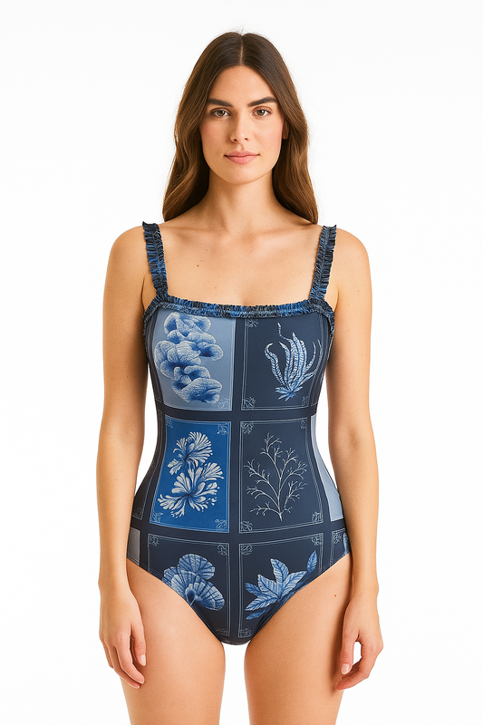 Koyu mavi tonlarında, botanik desenlerle süslenmiş kare çerçeveli bir tasarıma sahip. Yapraklar ve çiçek motifleri...