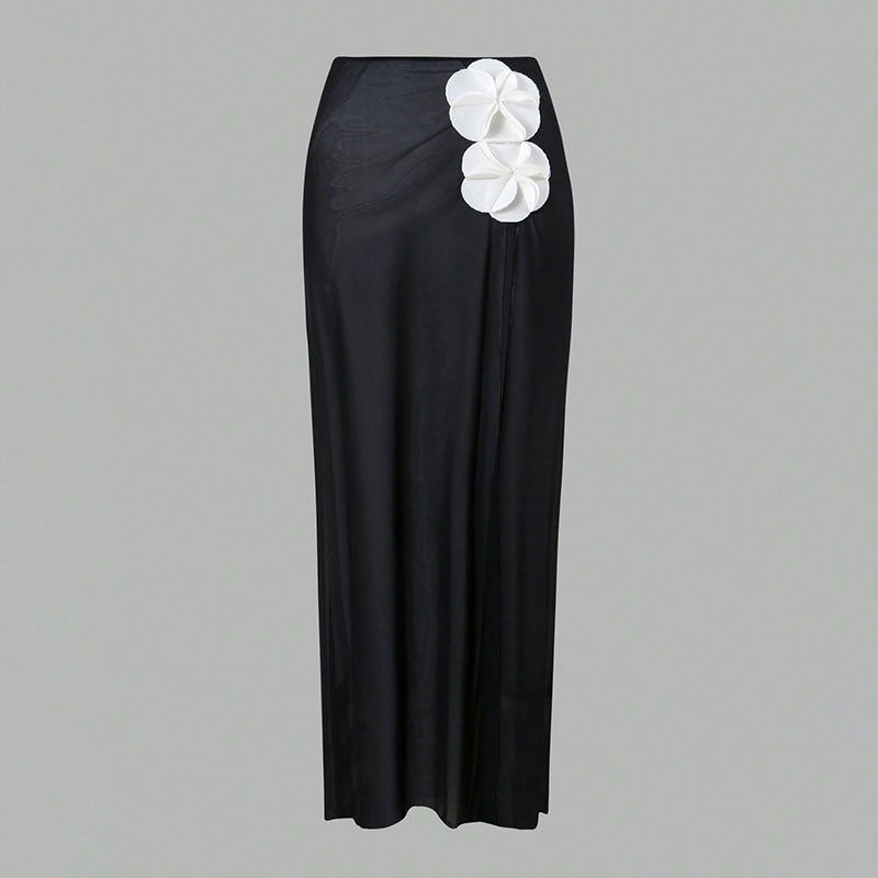 Pareo: Siyah uzun model, beyaz çiçek detayıyla bütünlük sağlayan tasarım