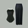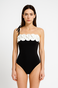Minimalizmin asaleti ve çiçeklerin zarif dokunuşunu bir araya getiren bu siyah mayo seti, sahil şıklığını bir üst seviyeye taşıyor. Straplez kesimiyle modern bir görünüm sunarken, göğüs ve pareo kısmındaki beyaz çiçek aplikeleri dikkat çekici bir kontrast oluşturuyor. Hem rahatlığı hem de estetik görünümüyle lüks plaj tarzını yansıtıyor.
