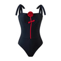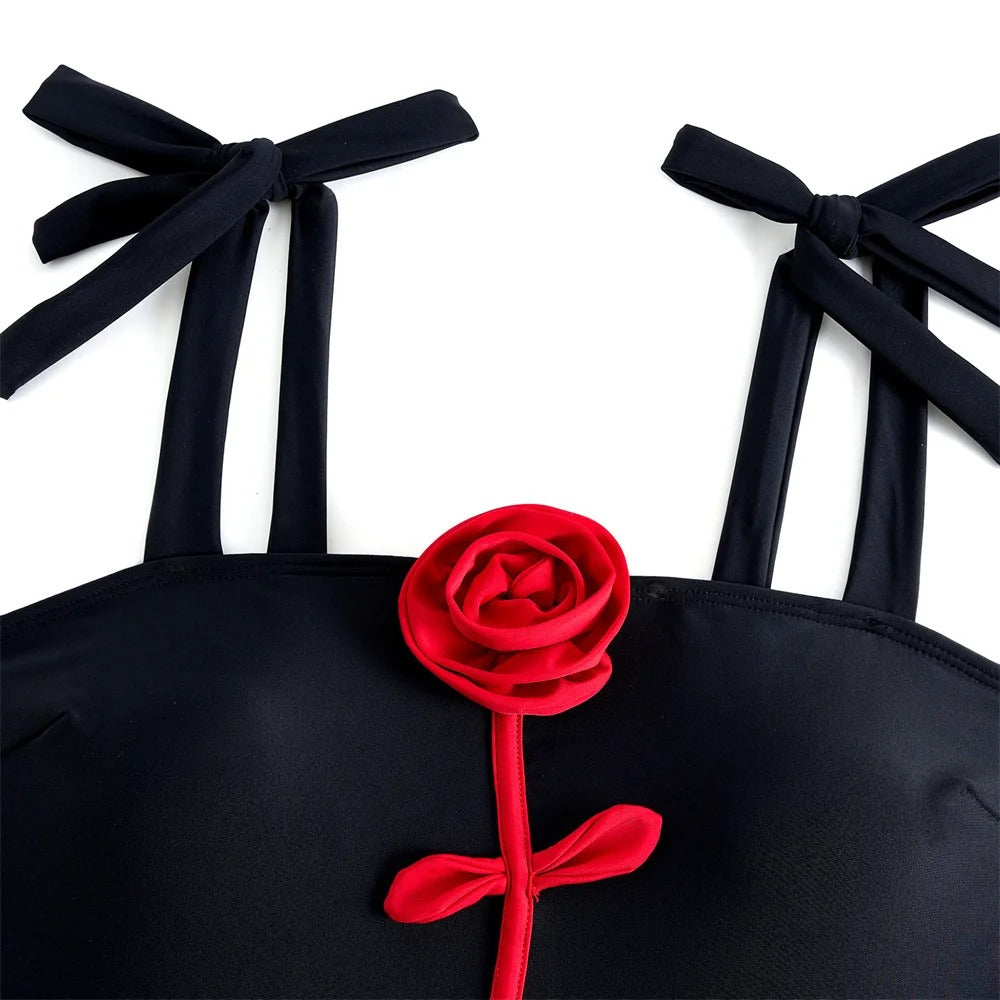 Klasik siyah üzerine kırmızı çiçek detayı, zarif ve çarpıcı bir kontrast yaratır.