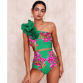 Tek omuz ve fırfır detaylarıyla şıklık katarken, yüksek bel bikini altı vücudu toparlayarak fit bir görünüm sunar.