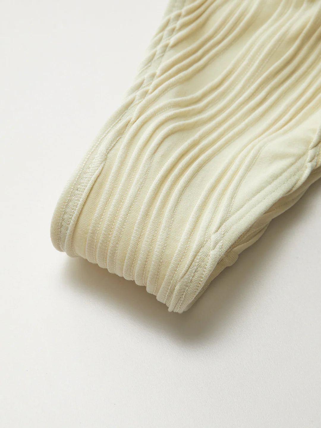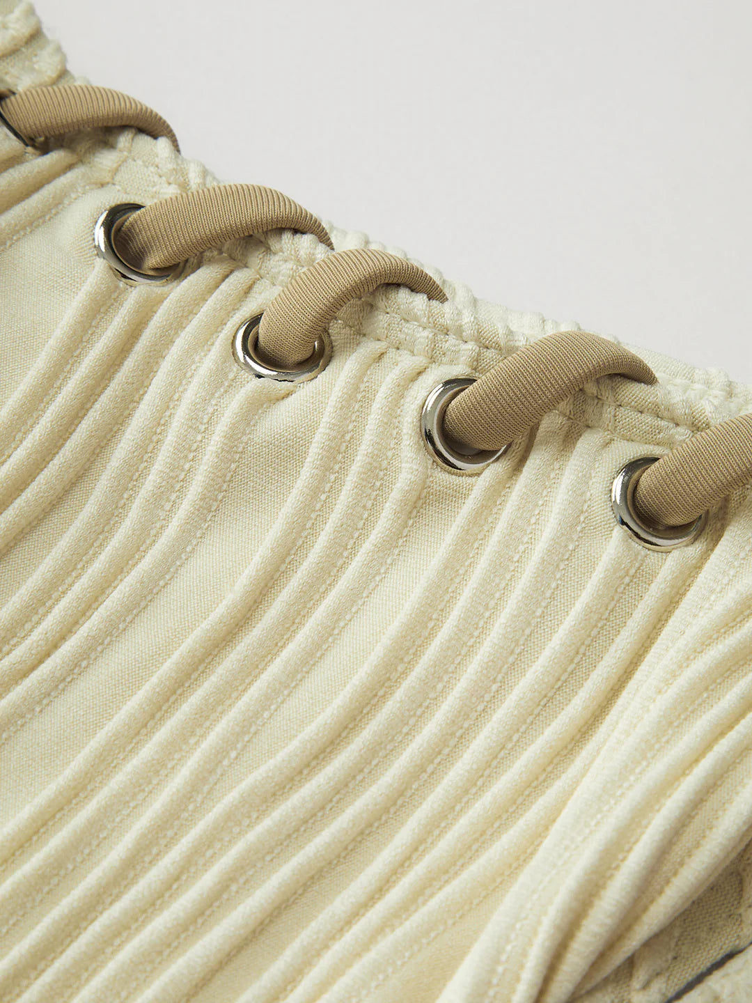 Pliseli kumaş ve üst ile alt parçalarda kullanılan ip bağlama tasarımı, hem hareket özgürlüğü hem de estetik bir görünüm sunar.