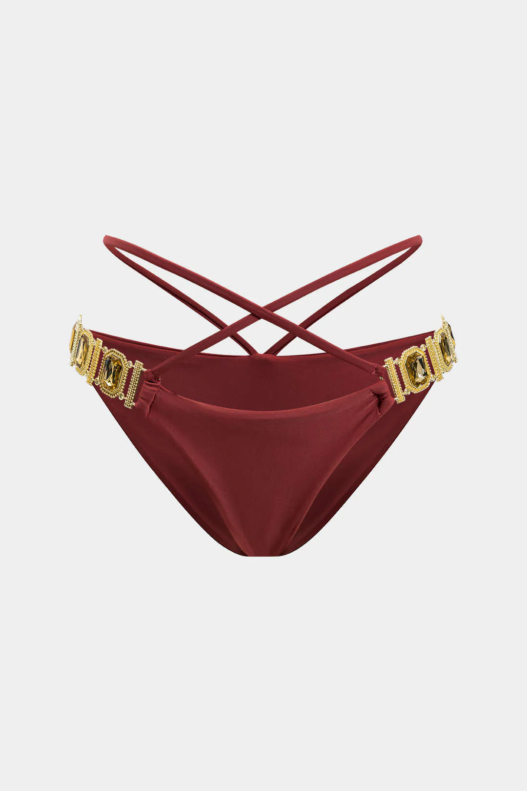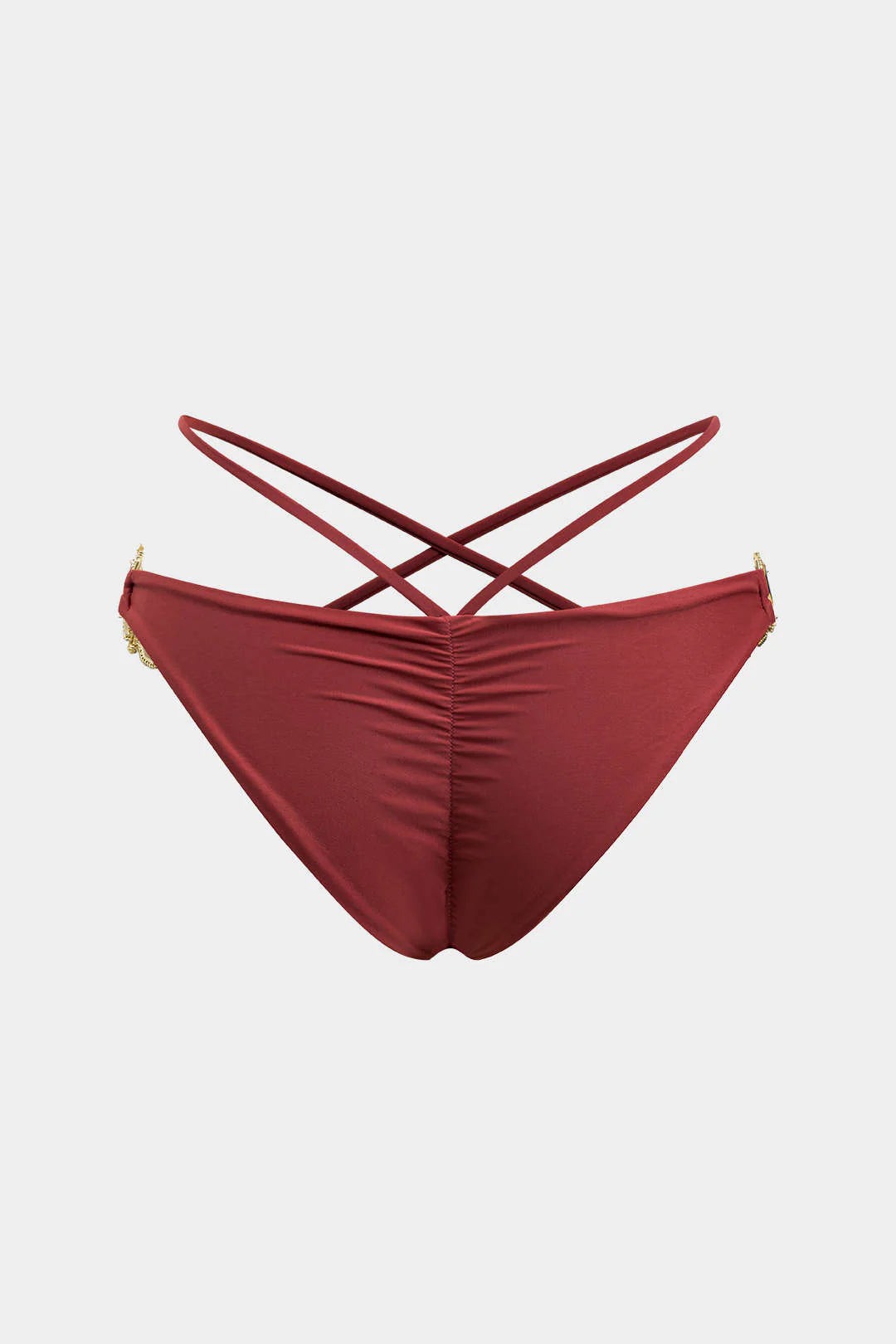 Alt: Düşük bel bikini altı, bel kısmındaki çapraz bağcık detaylarıyla cesur ve feminen bir hava katar. Yanlarda altın rengi süslemeler, premium bir his uyandırır.