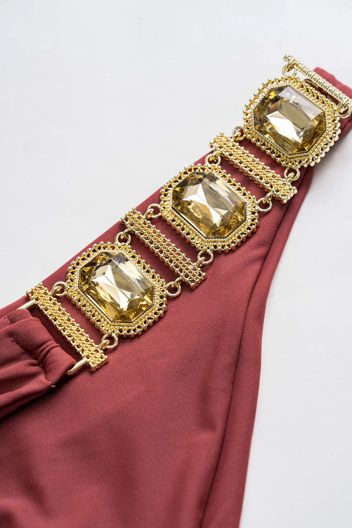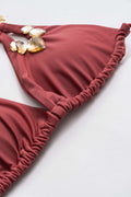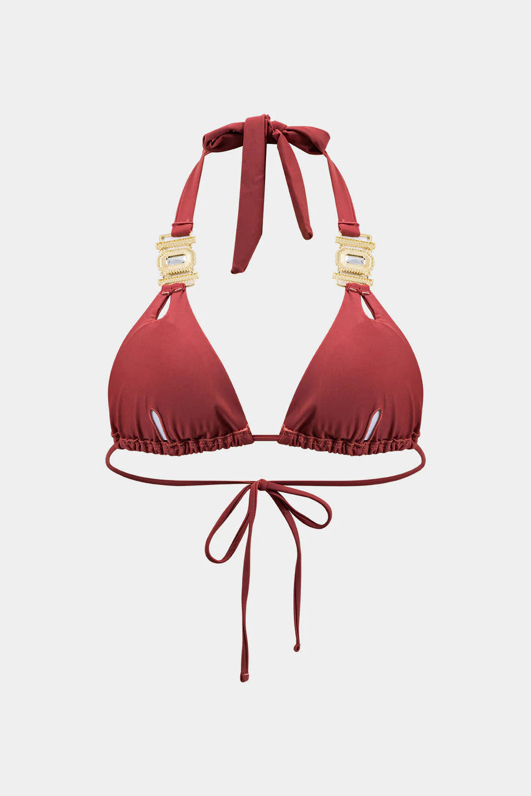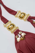 Üst: Üçgen kesim bikini üstü, klasik bir halter bağlama stiline sahiptir. Göğüs kısmındaki altın rengi ve taş detayları, lüks bir görünüm kazandırır.