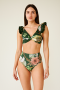 Doğadan ilham alan zarif çiçek desenleriyle tasarlanmış bu bikini seti, sofistike ve feminen bir plaj stili sunuyor. Katlı fırfır detaylı omuz askılarıyla romantik bir görünüm kazanan bikini üstü, yüksek bel alt kısmıyla vücuda uyum sağlar. Aynı desenli pareo ise asimetrik fırfır tasarımıyla kombini tamamlar ve yazın enerjisini sahillere taşır.