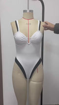 Şık ve zamansız bir görünüm sunan beyaz-siyah kontrastlı tek parça mayo, hem rahatlık hem de estetik isteyen kadınlar için özel olarak tasarlanmıştır. Göğüs bölgesinde yer alan hafif büzgü ve metalik “U” detayı, feminen bir şıklık katarken, yan panellerdeki siyah şeritler vücudu olduğundan daha ince ve uzun gösterir.