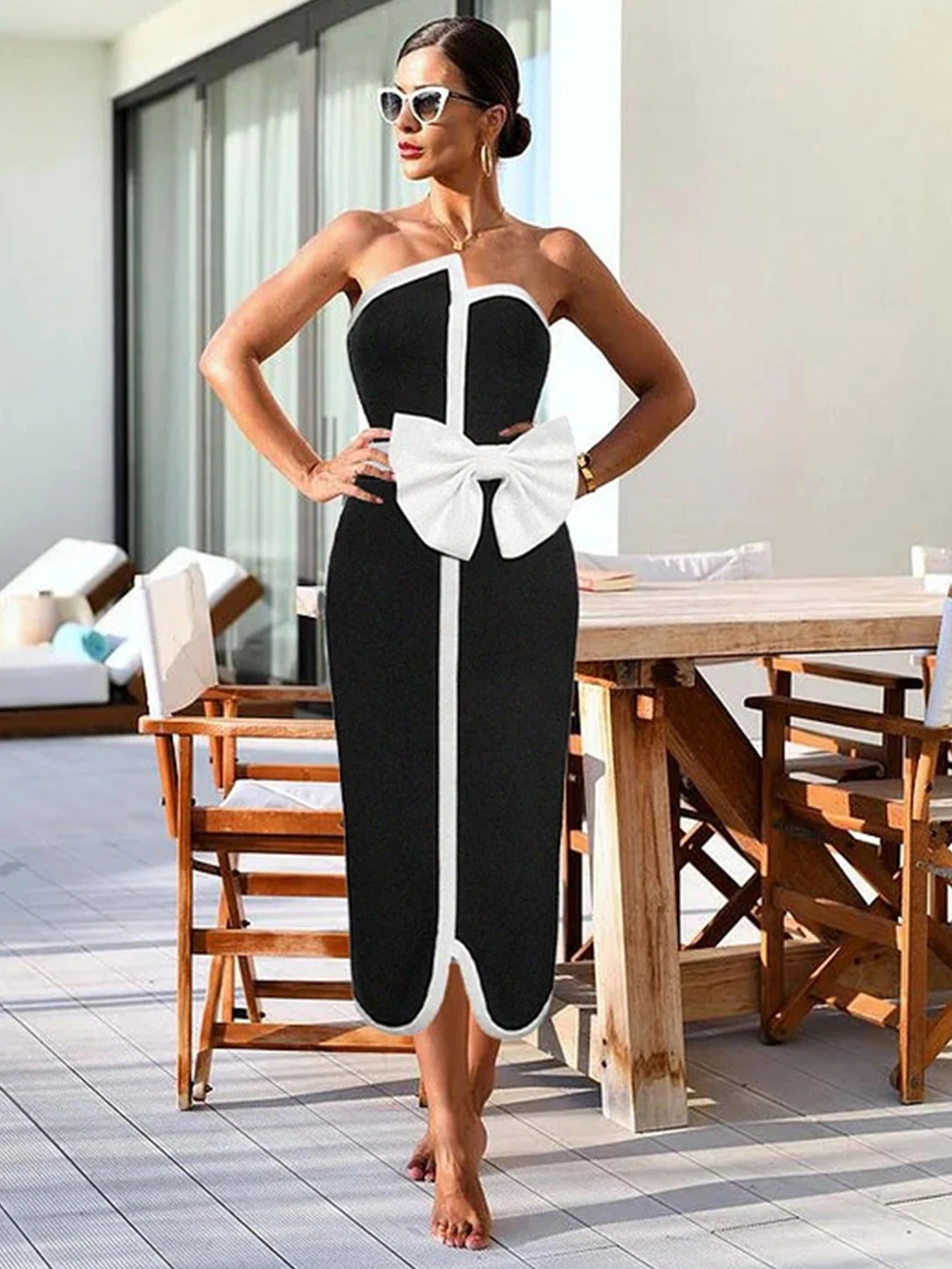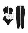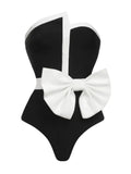Tek omuz, asimetrik kesimli mayo: Göğüs hizasındaki dev beyaz fiyonk, sofistike bir feminenlik katar.