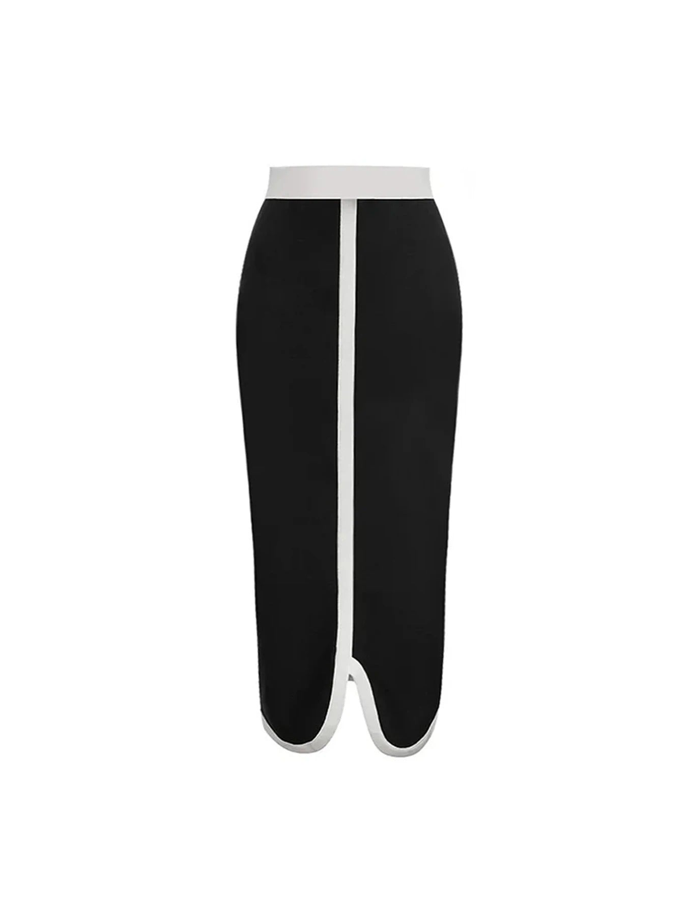 Yüksek bel kalem etek: Diz altı uzunluğu ve ortada hafif yırtmaç detayı ile zarif bir siluet oluşturur.