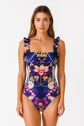 Çarpıcı çiçek desenleri ve renkli geometrik detaylarla süslenmiş bu mayo, şıklığı ve feminenliği ön planda tutar.