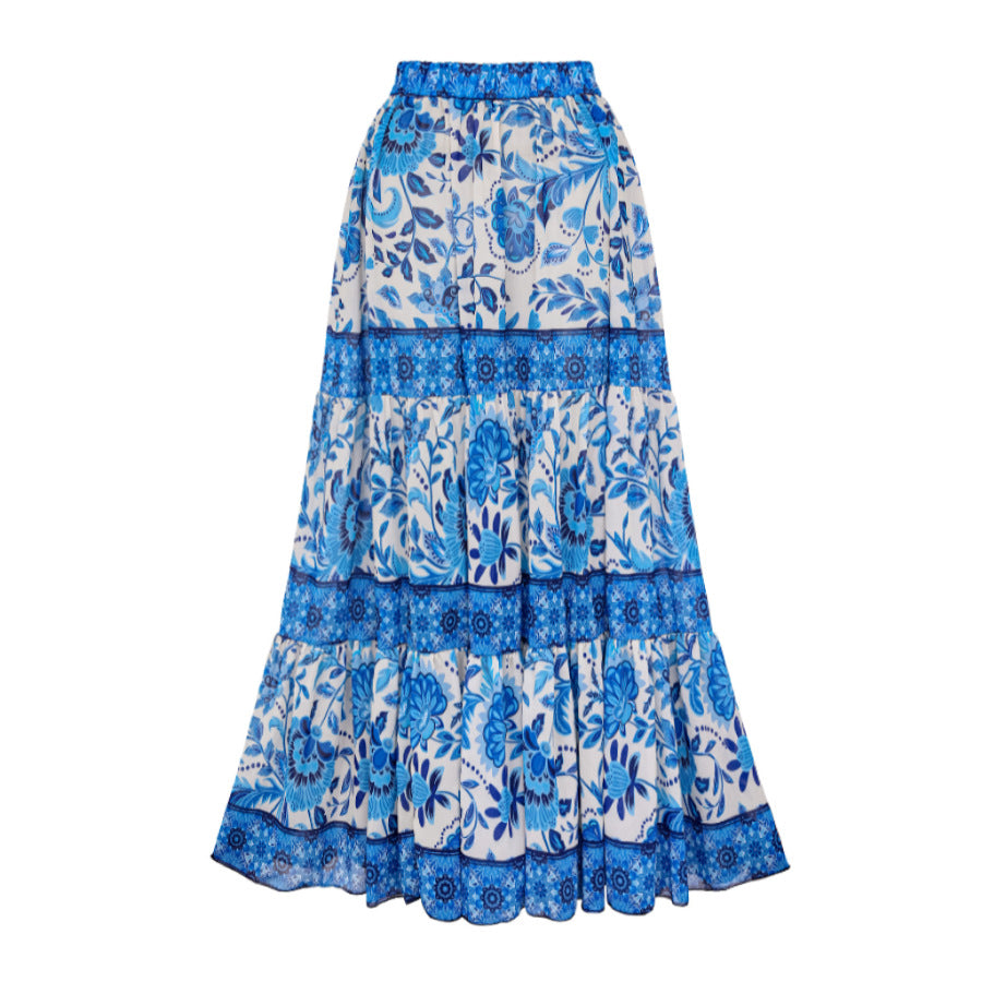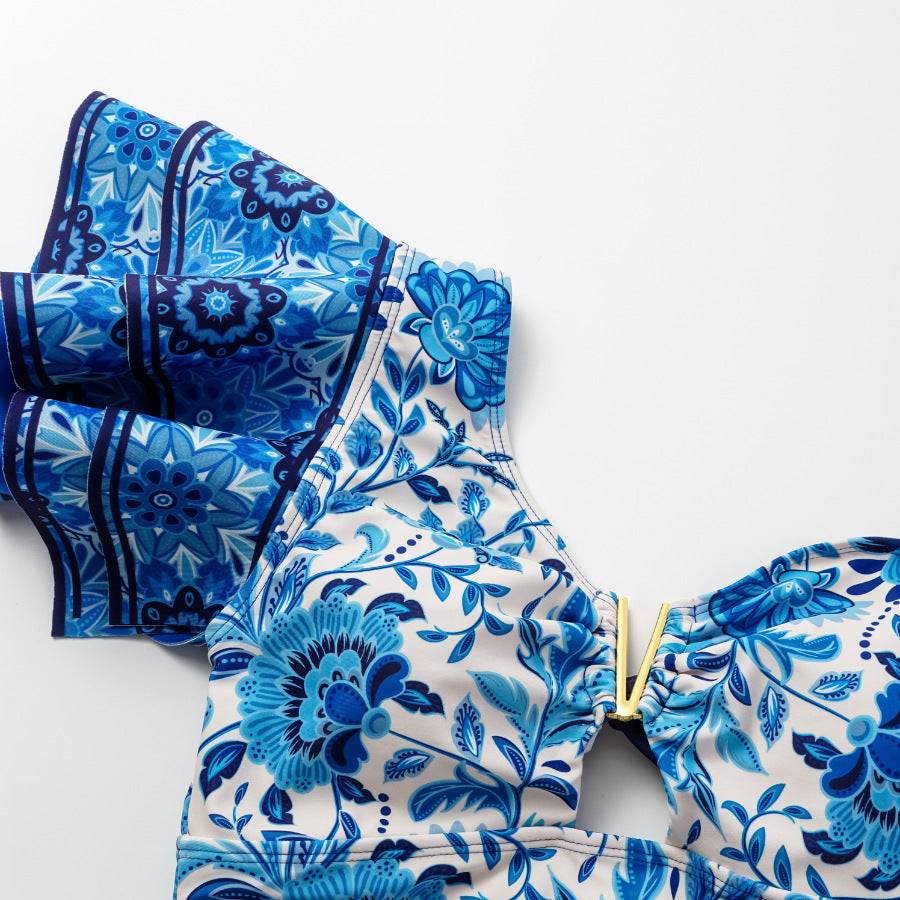 Aynı desenin devamı olan eteği, mayoyla bütünlük oluşturur.