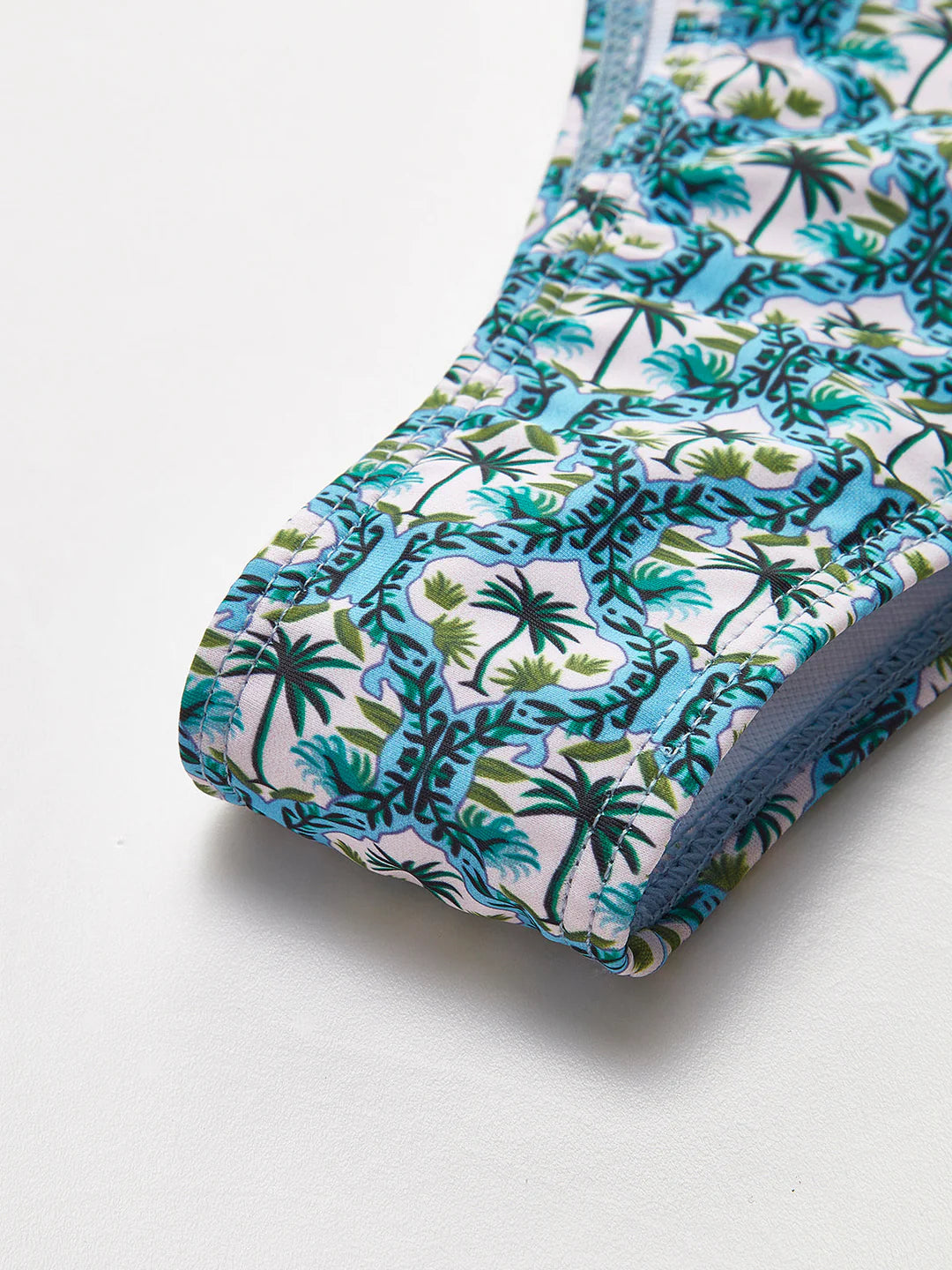 Zemin rengi turkuaz ve desenlerde kullanılan beyaz, sarı ile doğadan ilham alan bir harmoni sağlanmıştır.