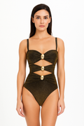 Altın ışıltısıyla göz kamaştıran bu özel tasarım mayo, zarif kesimi ve şıklığı bir araya getiriyor. Vücuda oturan formu ve dikkat çekici üç adet altın tokasıyla plajda veya havuz başında stilinizi konuşturun. Kadife dokulu, metalik parlak kumaşı sayesinde hem sofistike bir görünüm hem de yüksek konfor sunar.