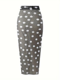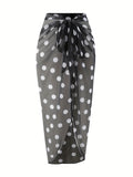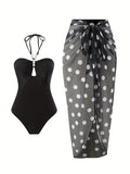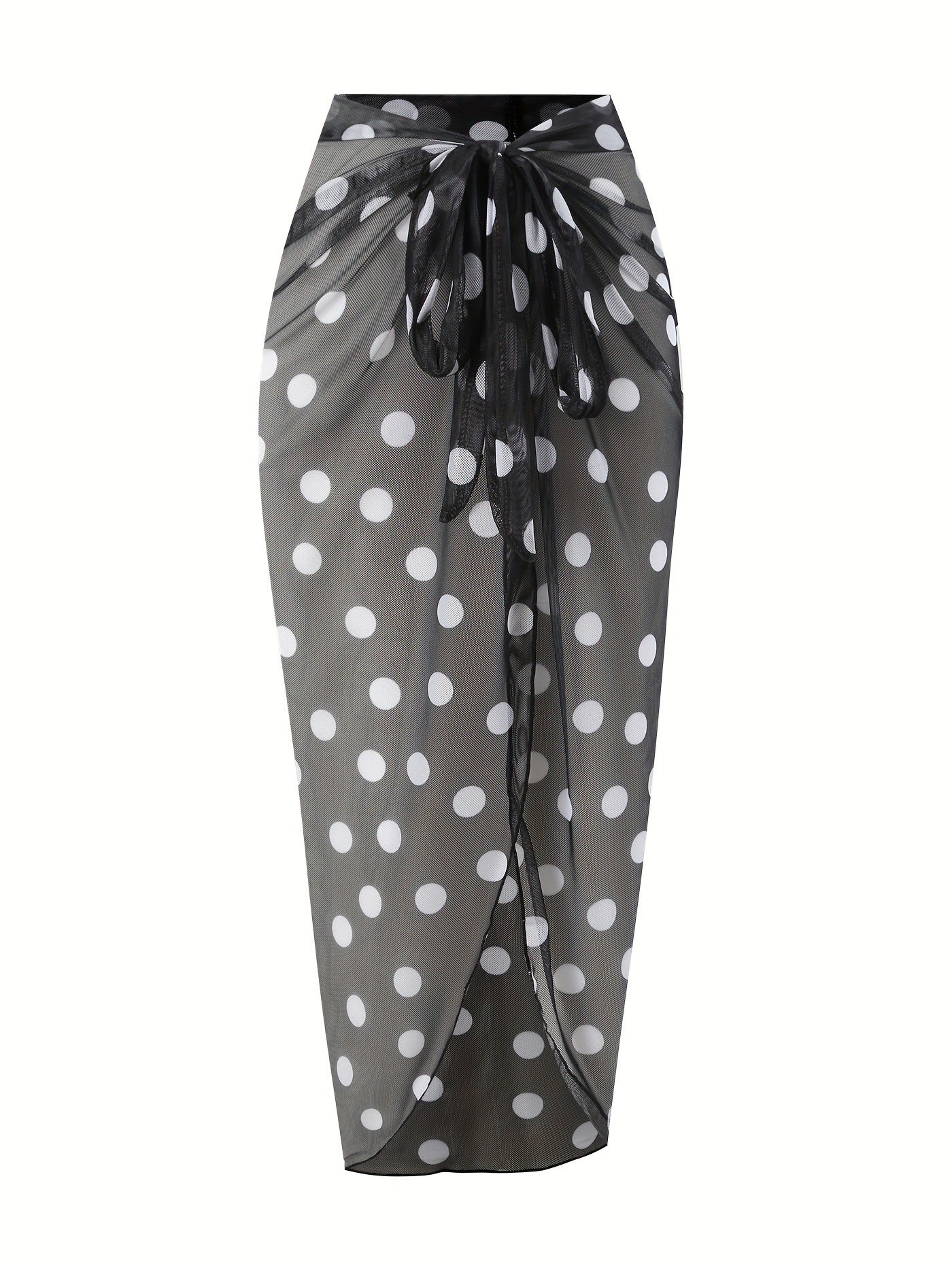 Takımın pareo eteği, siyah tül üzerine beyaz puantiye deseniyle retro esintiler taşır.