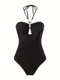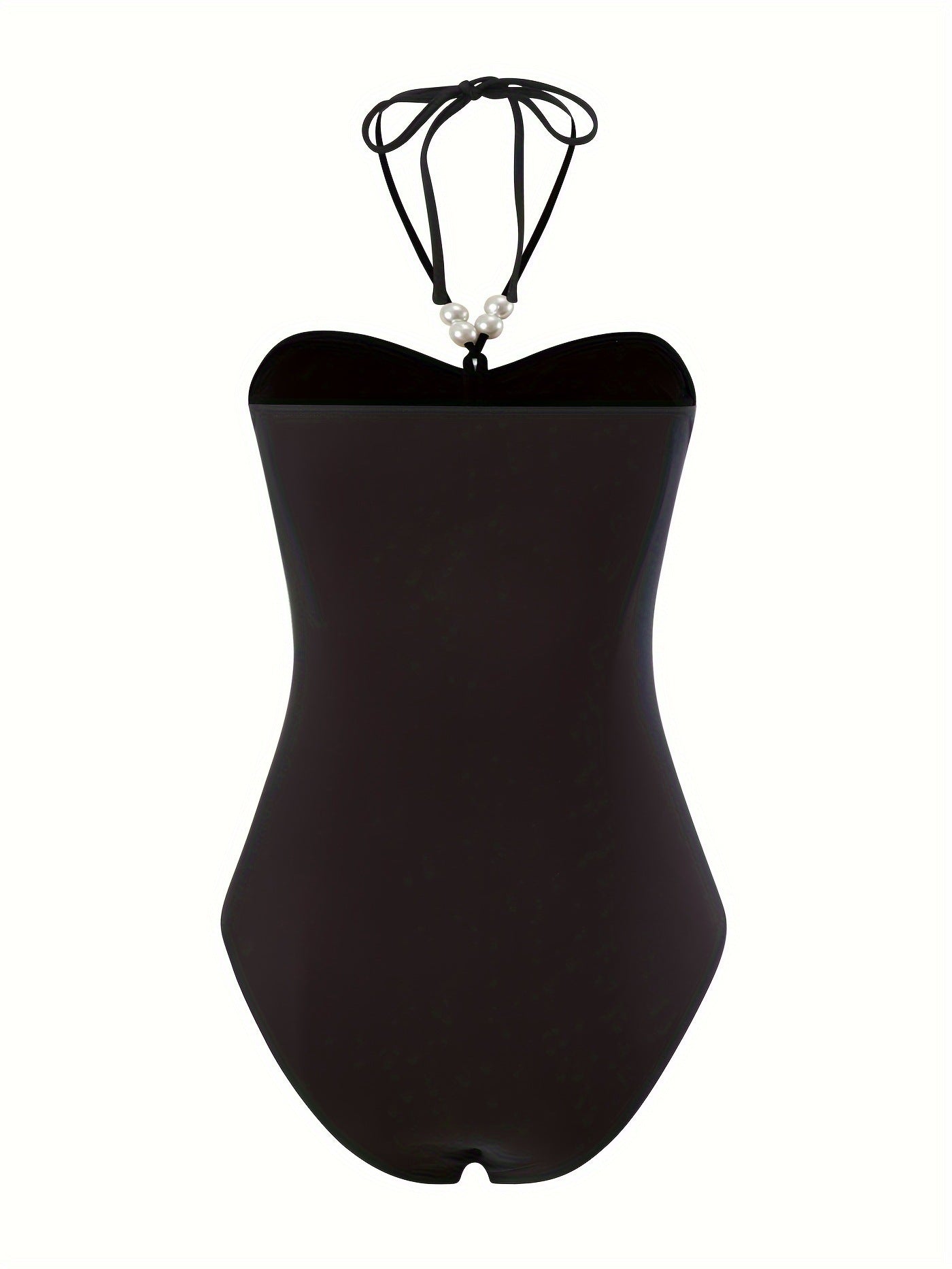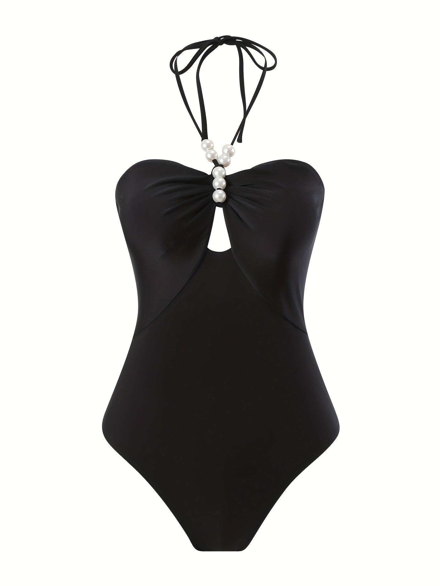 Tek parça siyah mayo, derin göğüs dekoltesi ve inci detaylı boyun bağlamasıyla sofistike bir görünüm sunar.