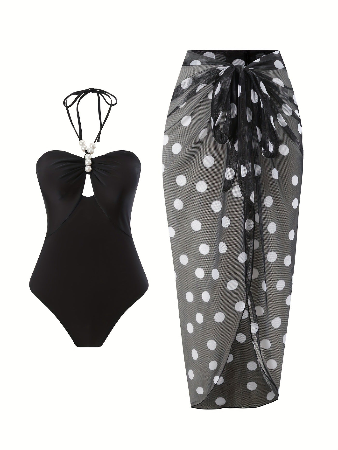 Klasik siyahın asaleti, inci detayıyla buluşuyor! Zarif ve feminen bir tarzı tercih eden kadınlar için tasarlanan bu mayo seti, nostaljik puantiye desenli pareo eteğiyle stilinizi tamamlıyor.