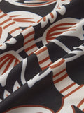 Siyah zemin üzerine kahverengi, beyaz ve turuncu tonlarında tropik yaprak ve bitki desenleri bulunmaktadır.