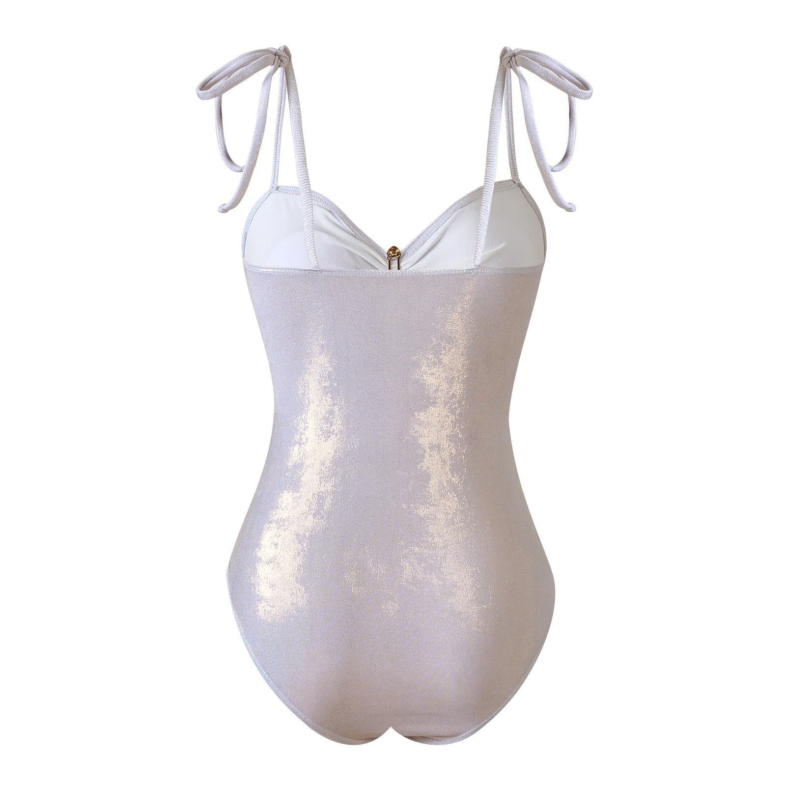 Üst parça, tek parça mayo formundadır. Göğüs kısmında altın renkli halka detayına sahip şık bir kesik bulunur.
