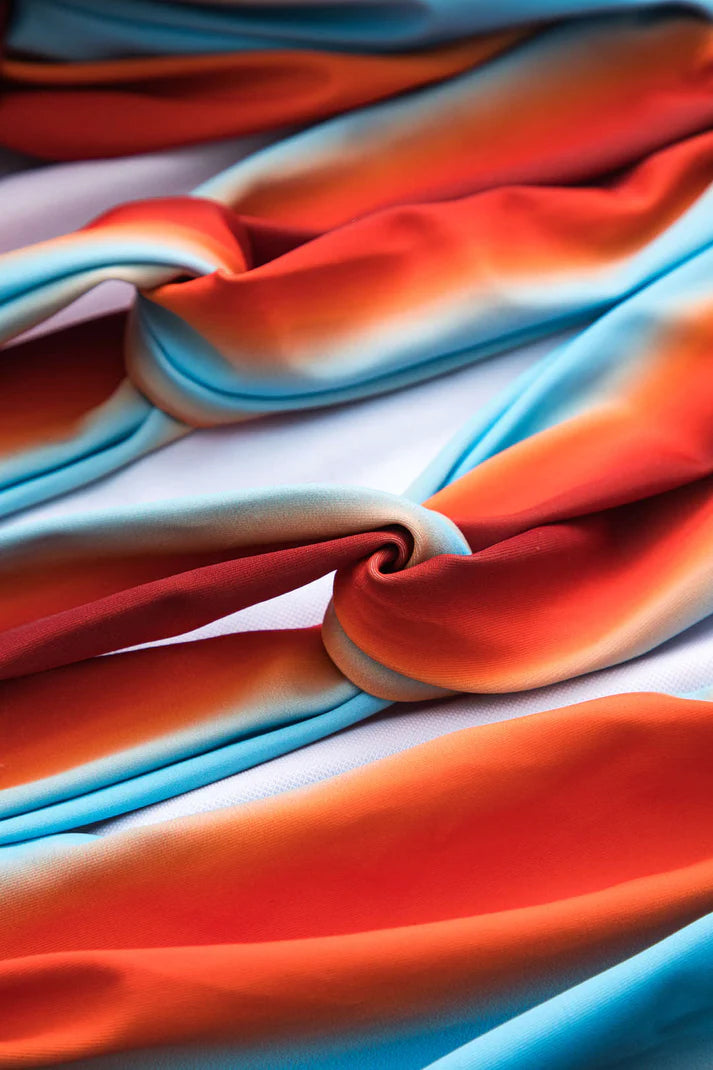 Renk Paleti: Canlı turuncu, kırmızı, mavi ve sarının gün batımını andıran degrade geçişleri