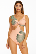 Takıma dahil olan uyumlu pareo, bel kısmından düğümlenebilir ve vücuda rahatça sarılır.