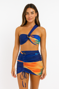 Tek omuzdan asimetrik bağlamalı, halkalı detay ile modernleştirilmiş bandeau tarzı üst, bustiyer şıklığında destek sağlar. Desenli kumaşı ve mavi bazlı renk tonları, gün batımı renklerini anımsatır. -