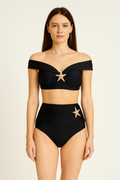 Şıklığı ve zarafeti bir arada sunan bu siyah bikini seti, deniz yıldızı detaylarıyla sahil modasına özgün bir dokunuş katıyor. Omuzsuz tasarımlı bikini üstü feminen bir siluet yaratırken, yüksek bel bikini altı vücuda uyum sağlayarak rahat ve toparlayıcı bir kullanım sunar. Aynı renkte uyumlu pareo ise sade ama etkileyici bir plaj stili tamamlar.