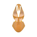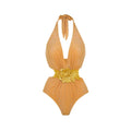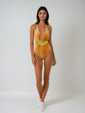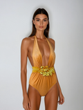 Parlak dokulu, ince simli kumaş kullanılmıştır; bu da mayoya lüks bir hava katar.