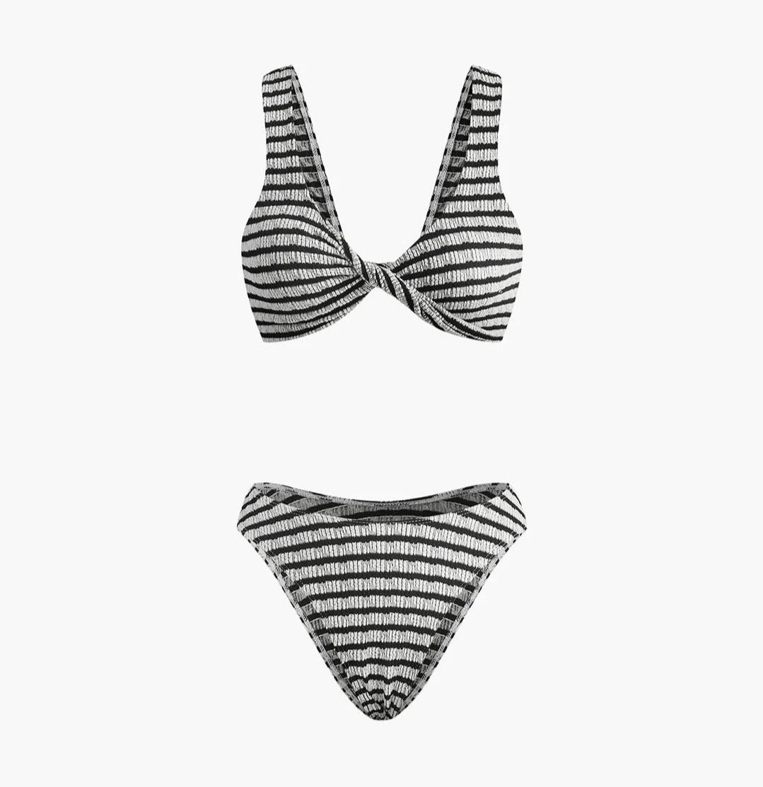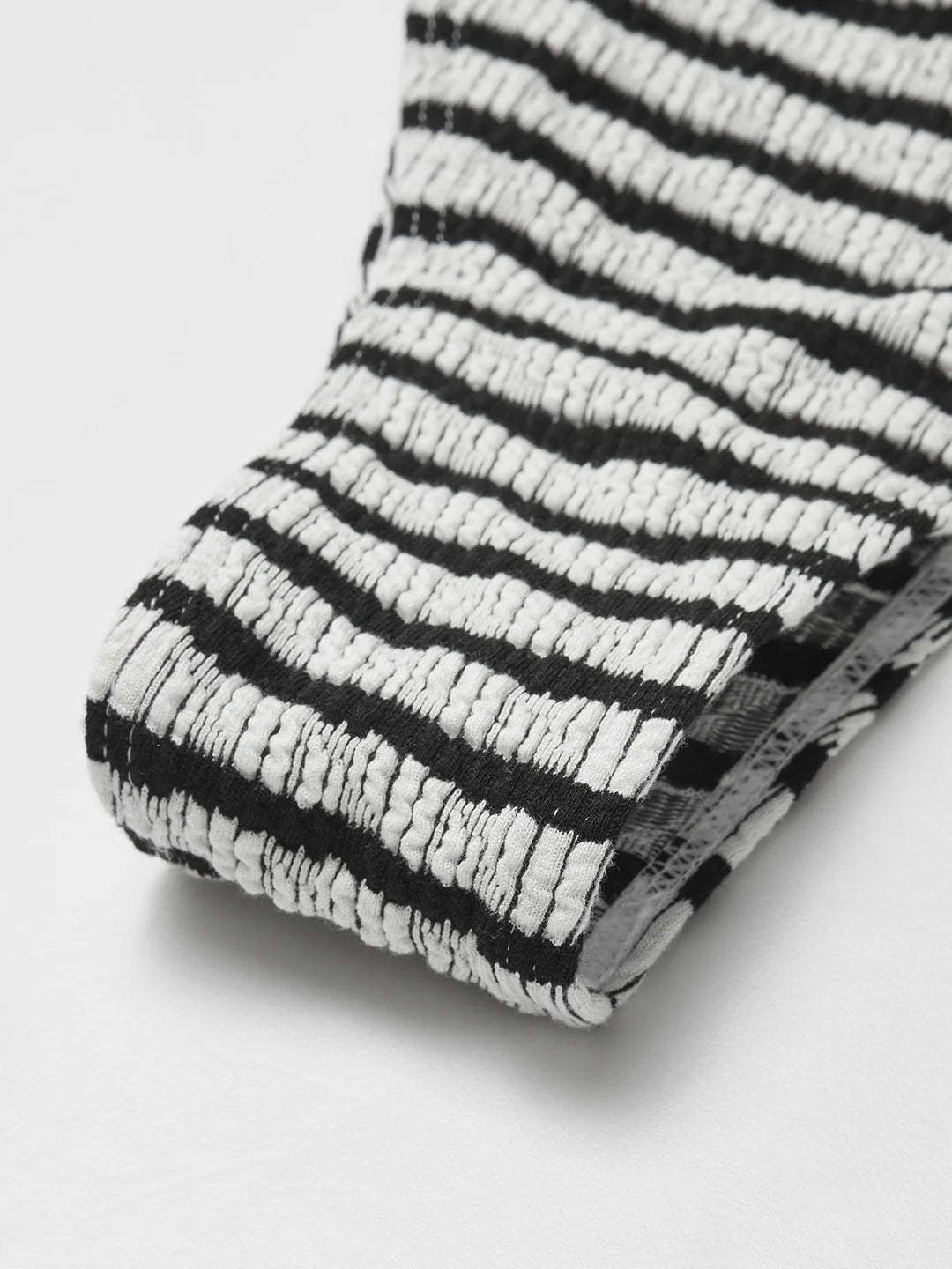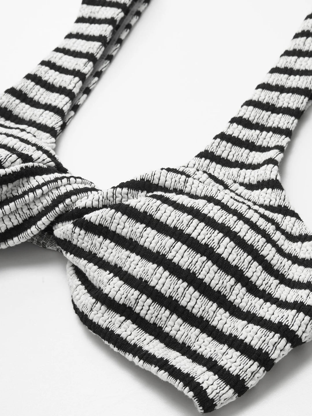 Siyah ve beyaz tonlarında yatay çizgili desene sahiptir.