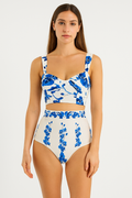 Zarif ve feminen çizgileriyle dikkat çeken bu üçlü set, beyaz zemin üzerine yerleştirilmiş mavi çiçek desenleriyle yaz stiline modern bir yorum katıyor. Kare askılı bikini üstü, göğüsleri destekleyen formuyla güvenli bir kullanım sunarken; yüksek bel bikini altı vücut hatlarını toparlayarak zarif bir görünüm kazandırıyor. Maxi boy kloş etek ise seti tamamlayan şık bir parça olarak hem plaj hem de günlük yaz kombinlerinde rahatlıkla kullanılabiliyor.
