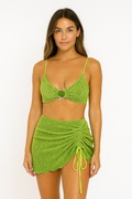 Asimetrik ve yan büzgü detaylı mini etek formlu alt parça ile hem cesur hem feminen bir siluet yaratır.