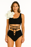 Şıklığı ve cesareti bir arada sunan bu siyah bikini seti, özel tasarım detaylarıyla öne çıkıyor. Üst parçada yer alan büyük beyaz çiçek aksesuarı, feminen ve sofistike bir hava katarken, belden dolamalı ip detayı vücut hatlarını zarifçe vurguluyor. Yüksek bel alt parça, modern ve rahat bir görünüm sağlarken, kalp desenli siyah şeffaf pareo kombini tamamlıyor.