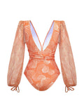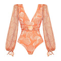 Sahilde göz kamaştırmak isteyen kadınlar için tasarlanmış bu mercan tonlu mayo ve pareo seti, hem şıklığı hem de zarafeti bir araya getiriyor. Deniz kabuklarından ilham alan desenleri, zarif v yakası ve şeffaf uzun kollarıyla fark yaratıyor. Yüksek bel etekle kombinlenen bu mayo, plaj modasına sofistike bir yorum katıyor.