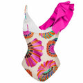 Yazın enerjisini renkli desenlerle buluşturan bu tek omuz mayo seti, feminen detayları ve dikkat çekici tasarımıyla sahil şıklığını yeniden tanımlıyor. Canlı desenlerin yanı sıra pembe fırfırlı omuz detayı ile öne çıkan mayo, vücut hatlarını zarifçe ortaya çıkarırken, aynı desenli pareo ile bütün bir kombin sunuyor.