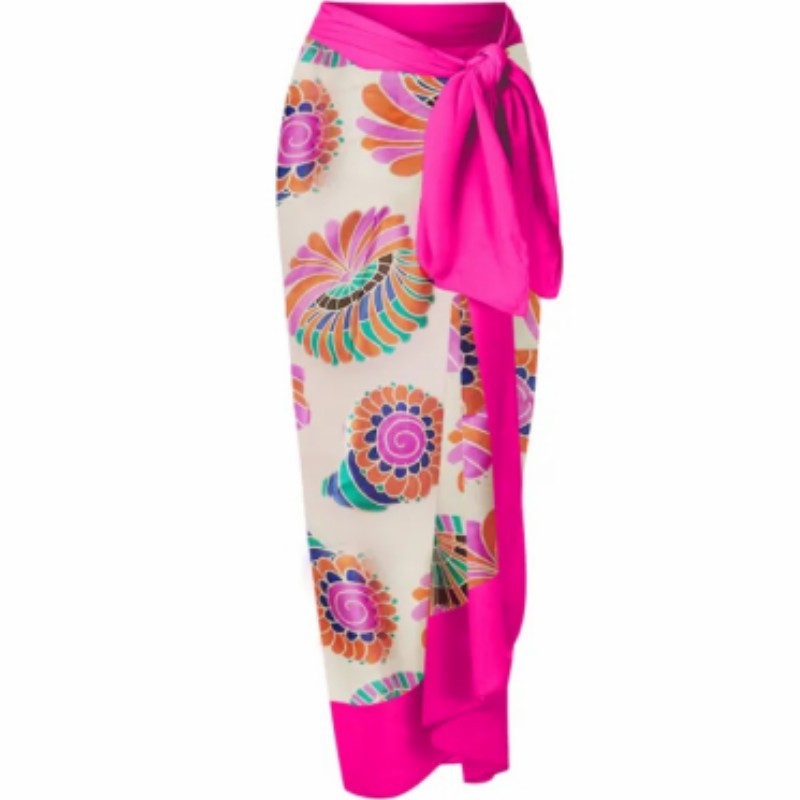 Pareo: Uzun, aynı desenli kumaş, belden bağlamalı, canlı pembe uç detaylı